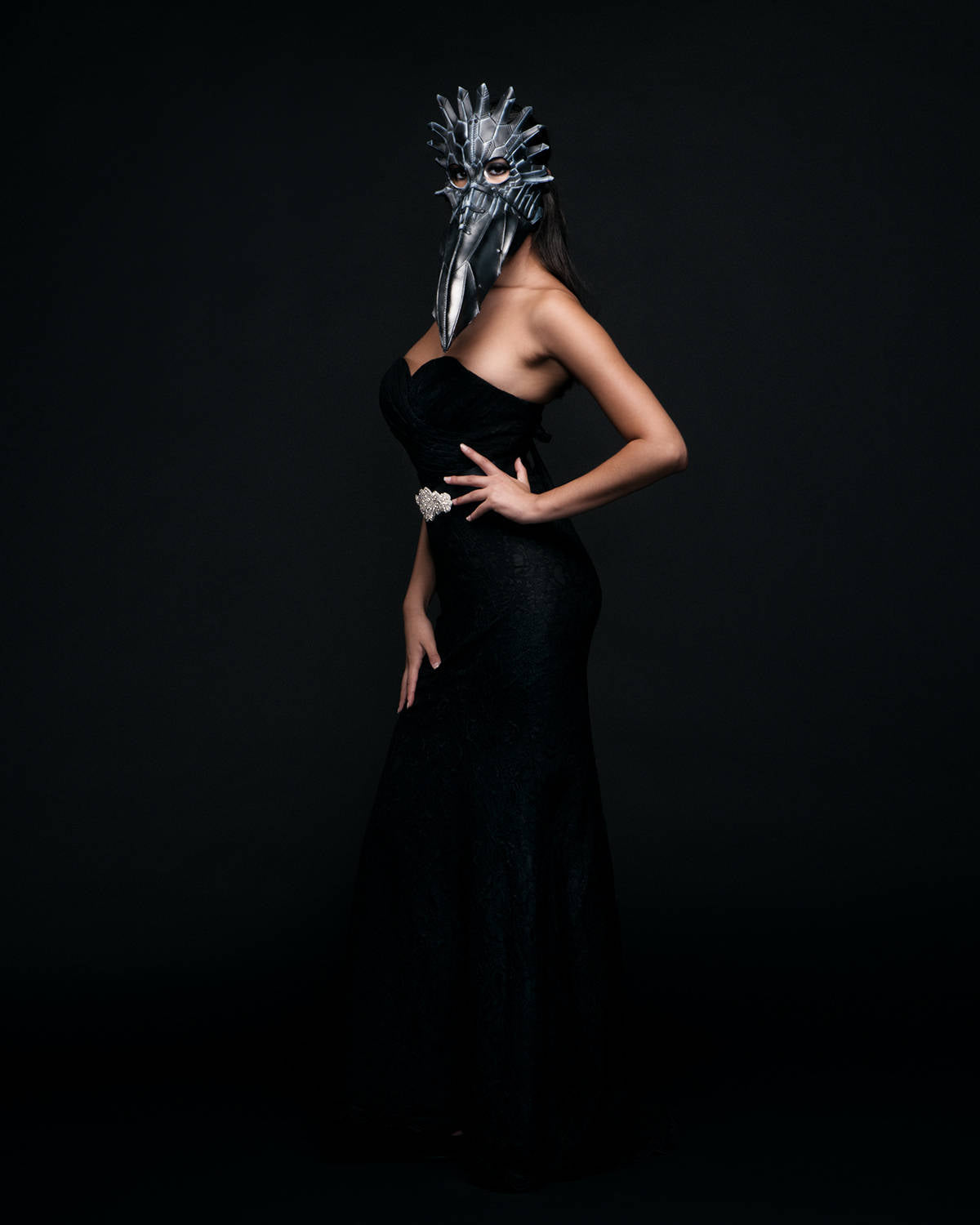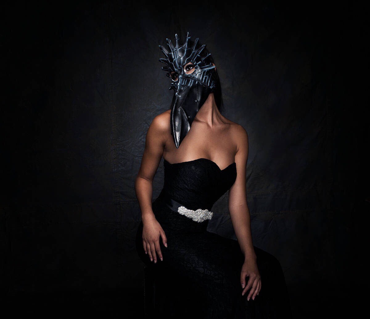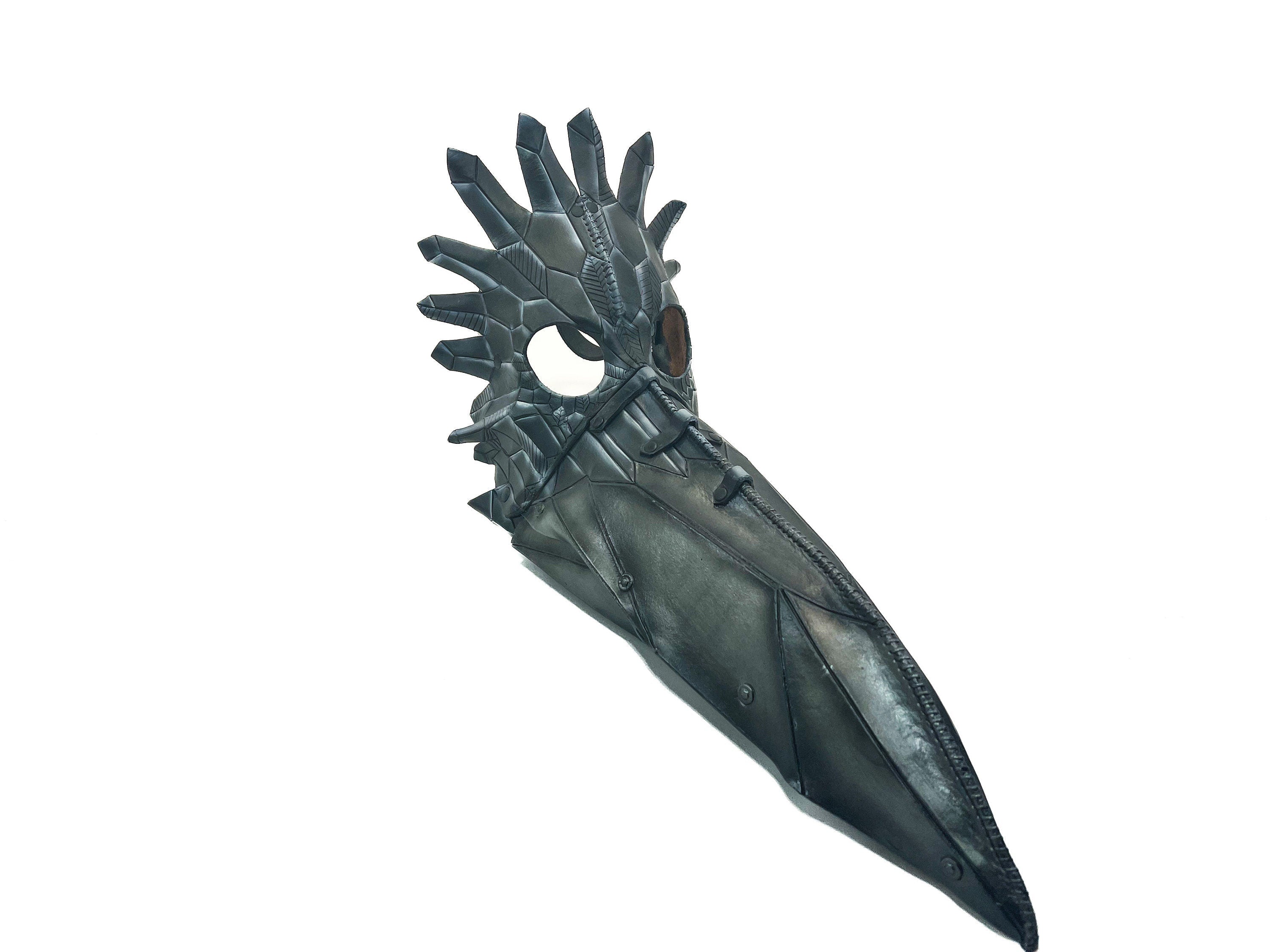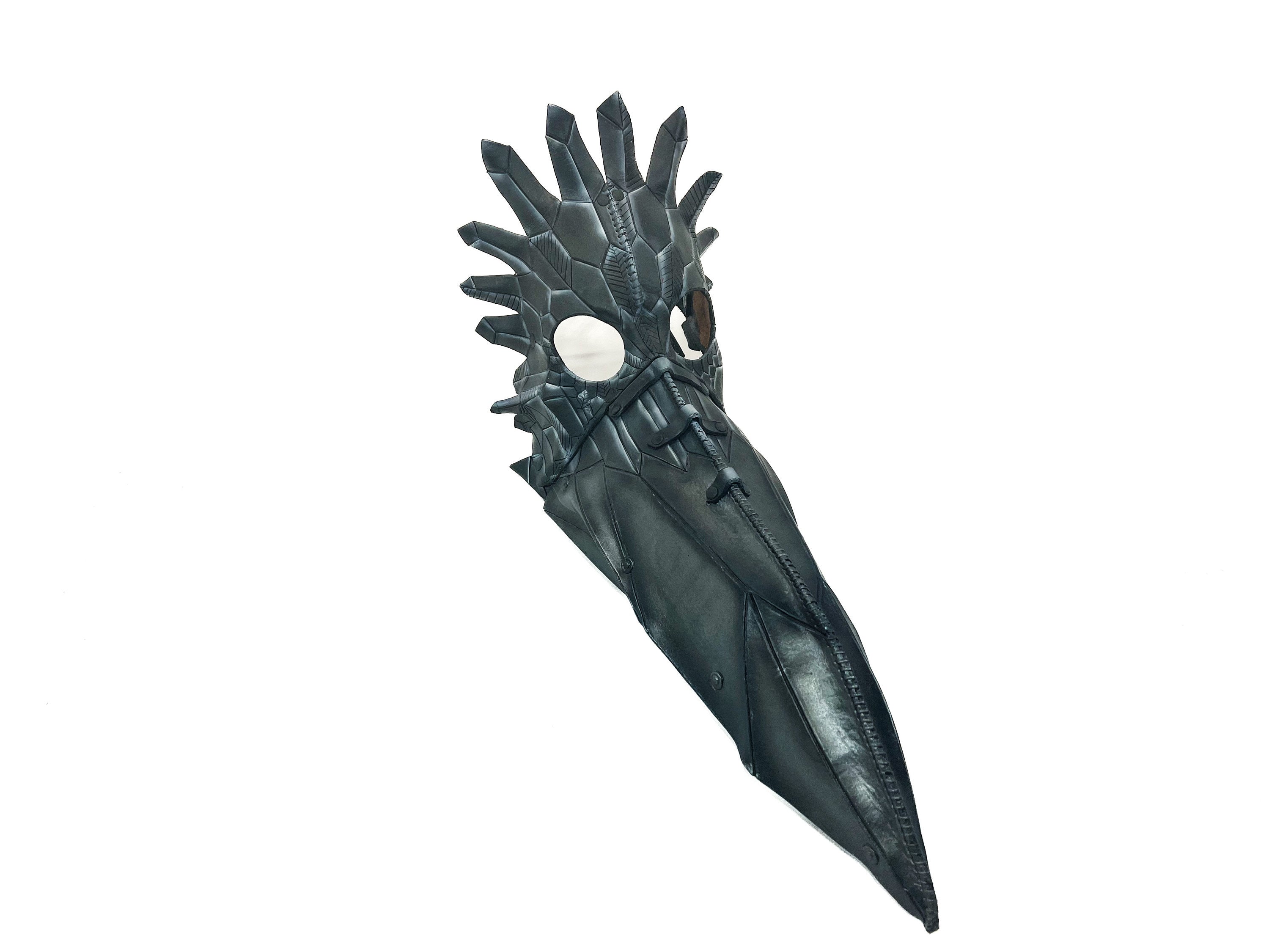 This genuine leather mask features a hand made large beak Raven in black and silver.