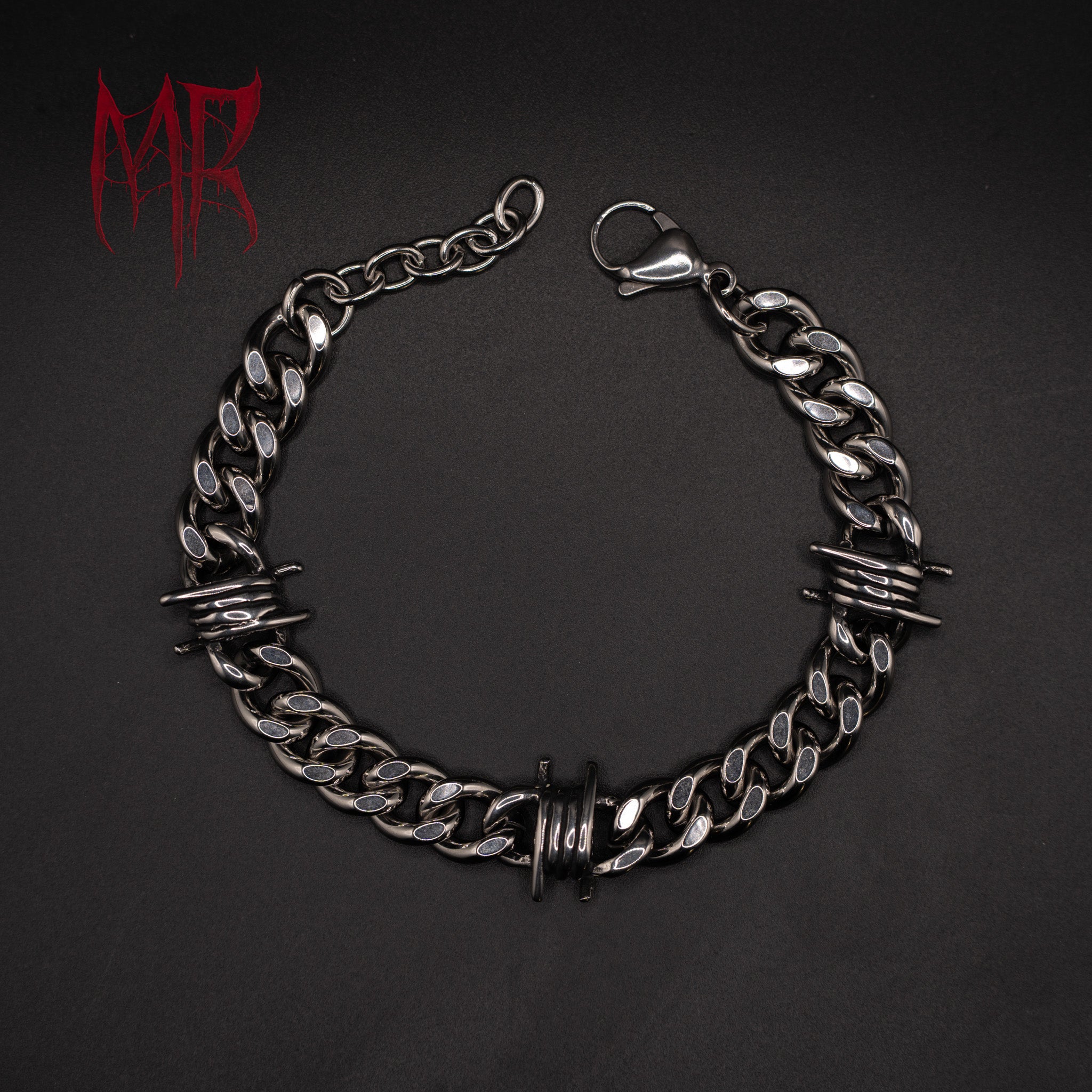 The Thorne Link Bracelet is a badass combination of a classic Cuban link and aggressive barbed wire detailing. Crafted from high grade Stainless Steel, it features a thorn wrapped aesthetic for a sharp, industrial edge.